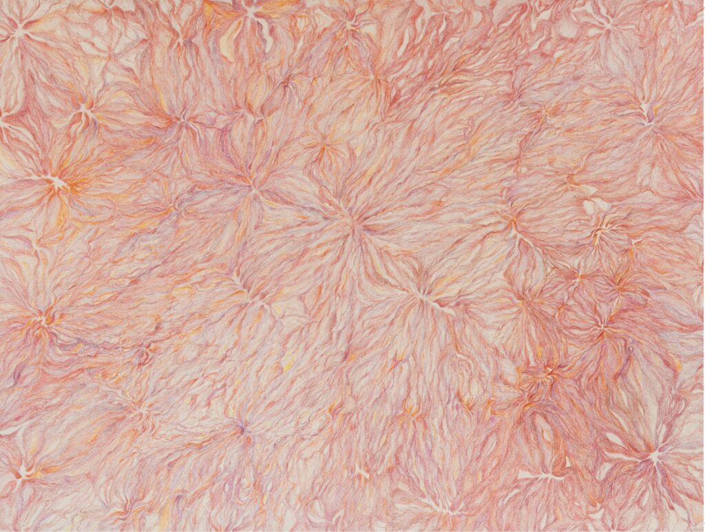 Die Zeichnungen entstehen in Schreib- und Reflexionsprozessen: dann, wenn die Worte nicht mehr einfangen können, was noch zu denken ist. Wenn sich Dinge immer noch weiter denken, aber keine Sprache mehr dafür da ist. Wenn es Monate bräuchte, bis das, was gerade lebendig vorm inneren Auge steht, eine sprachliche Fassung annimmt — und der Gedanke in der Zwischenzeit längst schon hintenüber gekippt und von der mentalen Bildfläche verschwunden ist. Dann greife ich zu Buntstiften und versuche die Qualität des Gedankens zu erfassen, seine Farben, seine Wucht, Zartheit, Eleganz, Hilflosigkeit, Kraft und Zerbrechlichkeit: Nach einer Weile nehmen die Zeichnungen dann ihre eigene Dynamik an und entwickeln ihre Form.